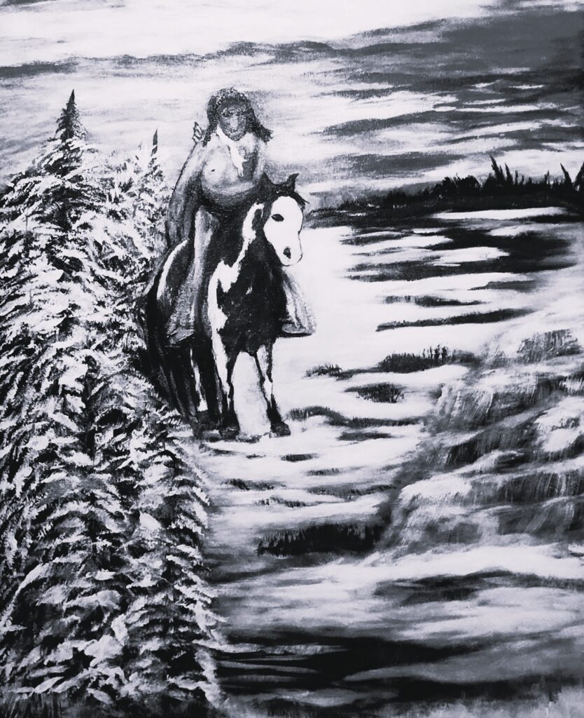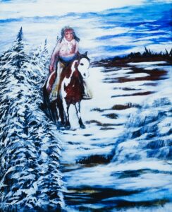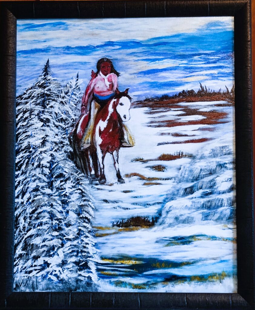 In this painting, the Pinto becomes more than a mount—it becomes a companion, a guardian, and a reflection of the scout’s own resilience. Together, they embody the harmony between people, animals, and the land they move through.